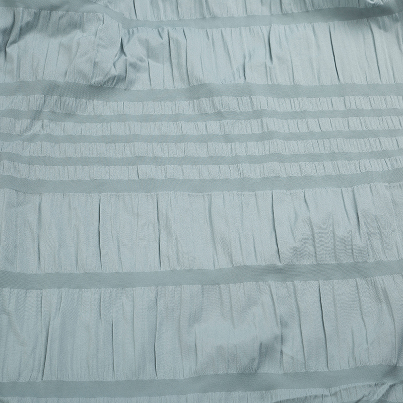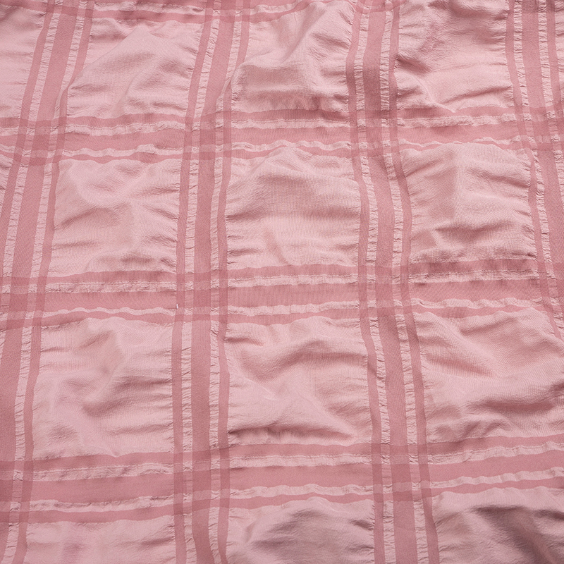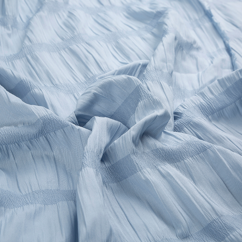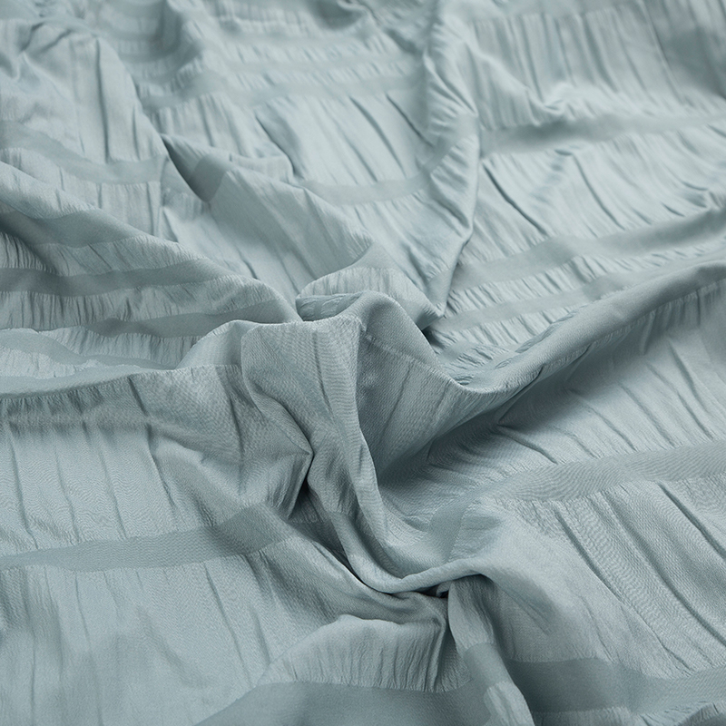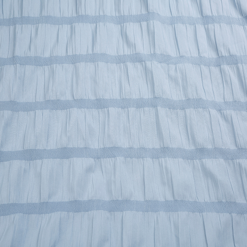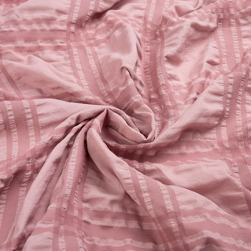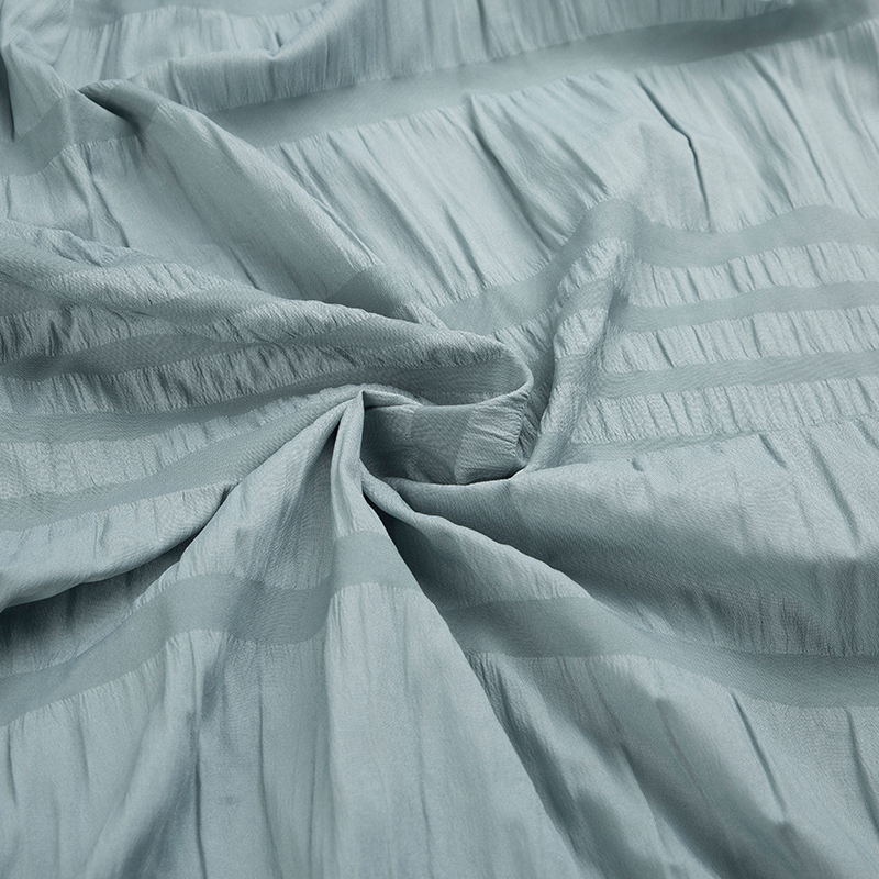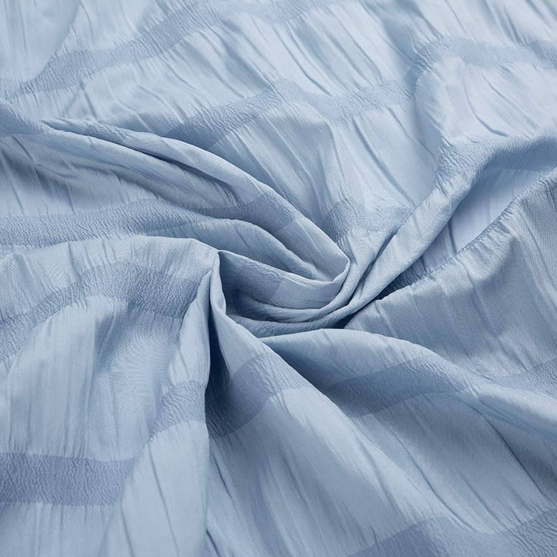全滌泡泡紗面料是我們公司開發(fā)的最新產(chǎn)品。這種特殊的織物是用不同的原料組合織成的。在高溫定型過程中,不同的紗線原料表現(xiàn)出不同的伸縮性,最后,織物會呈現(xiàn)出褶皺的效果。整個織物將呈現(xiàn)出泡沫狀的外觀。